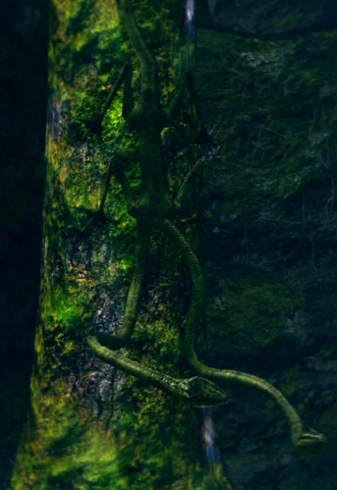 Двухголовая древесная ящерица, висящая на дереве, атакует, если подойти близко.