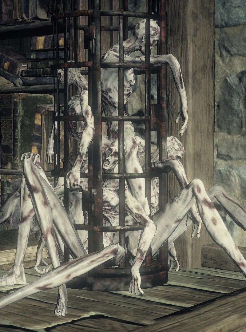 - Клеть-пауки в Подземелье Иритилла заполнены трупами Тюремщиков, а не простых полых.