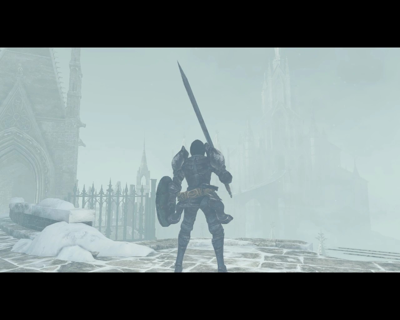 Выйдя во двор, вам предстоят сразиться с группой ледяных големов, а также колдуном, который стоит наверху. Пройдя двор и поднявшись по лестнице, слева вы обнаружите выемку в стене — там нет иллюзорных стен, это просто декорации. Идем дальше. Выйдя на мост, мы впервые встретим голема бастиона. Бой с ним лучше вести либо у самых ворот, либо выманить его под арку, так как справа по вам из башни будет стрелять колдун, что усложнит битву. После активации рычага откроются ворота. Слева можно увидеть ещё одного голема и трех сидящих полых. Идти туда нет смысла, дверь за ними пока закрыта, так что идем направо. Дверь тоже пока можно игнорировать, все сундуки за ней заморожены, и кроме противника мы там ничего не найдём. Победив на лестнице ещё одного голема, мы попадем на огромную крепостную стену. Тут следует быть предельно осторожным. Справа за баллистами стоят двое невидимых противников, на этот раз лучше не сталкиваться с ними, а повернуть налево. Пройдя башню, идем в левую дверь. Как только мы зайдем под арку, слева на нас бросится колдун с рапирой. За ним в комнате можно обнаружить рычаг, потянув который, мы поднимем тот самый лифт с гробницами, который мешал нам пройти в начале локации. Далее, выйдя на мостовую, поверните направо к башне, (но не заходите в дверь) и пройдите дальше до упора, там будет невидимая лестница. В сундуке вы найдете копьё пронзающей молнии. Не стоит сразу спрыгивать вниз к собакам: их много, лучше расстрелять их из лука. На балконе вы найдете душу великого героя, а внизу на трупе - человеческую фигурку. Вернувшись на мостовую и спустившись в самый низ, нам предстоит спрыгнуть с разрушенной лестницы, а значит обратного пути уже не будет. Когда выйдете на следующую мостовую, с вами снова заговорит Альсанна. Прямо перед собой вы увидите пламенеющую башню, в ней на алтаре лежит глаз жрицы, который позволит нам увидеть то, что раньше мы не могли, например, босса локации. Пройдя чуть дальше, вы столкнетесь с противником, которого не стоит недооценивать. Далее по пути, на трупах, можно подобрать красивый череп (х5) и фимиам скептика. Пройдя через туман, прямо перед собой вы увидите костёр, а слева будете атакованы прислужницей с посохом. После отдыха у этого костра, рекомендуется вернуться к первому костру, чтобы победить босса локации, который ранее был невидимым.