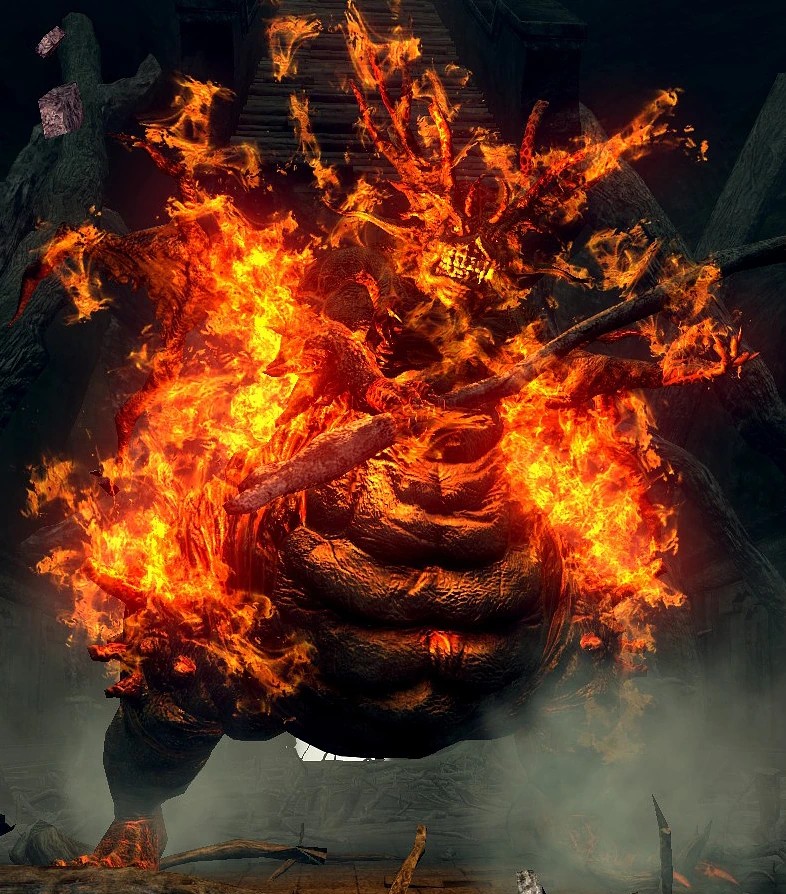 Выглядит как Демон Прибежища или Бродячий Демон, только у Мудрого демона Огня кожа объята пламенем. Он был первым демоном и последним магистром настоящего искусства огня, а потом Ведьму Изалита поглотил Хаос, и появилась Пиромантия. Много веков спустя после падения Изалита его труп и трупы остальных всевозможных демонов украшают арену битвы со Старым Королём демонов.