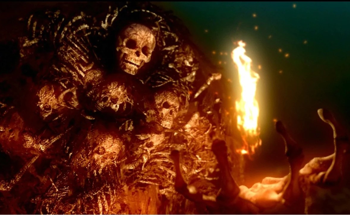 Внешне выглядит как гигантское нагромождение костей и черепов, образующих аморфный силуэт. В начале битвы он восстаёт из исполинского склепа в окружении тьмы.
