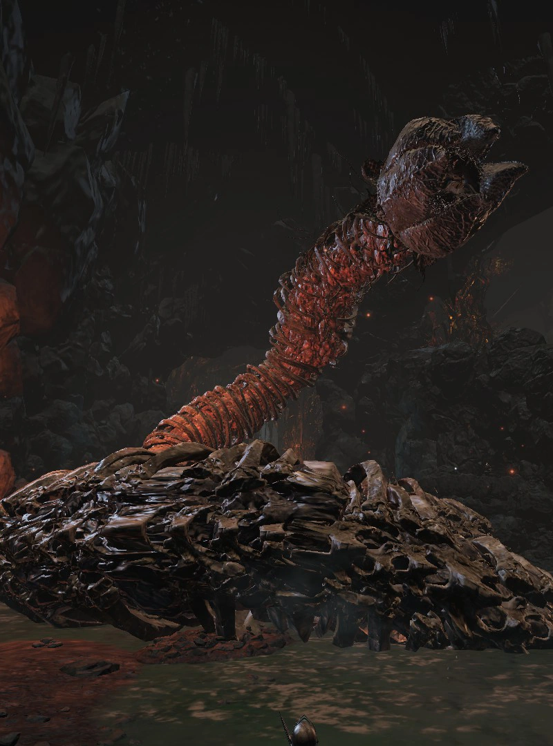 Огромный червь, выползающий из земли, когда вы подходите к арене с боссом Старый король демонов, и мешающий вам пройти.