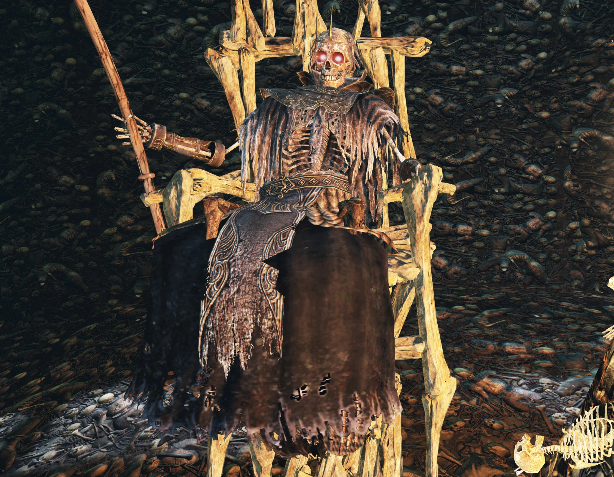 При помощи пиромантии Недвижимое пламя и дружественного фантома можно убить по одному такому лорду, что призовёт две армии скелетов, после чего, пока фантом отвлекает максимальное кол-во скелетов, вы должны применить 1–2 раза Недвижимое пламя, затем фантом подводит на вашу пиромантию скелетов. Также можно использовать пиромантию Покров пламени.