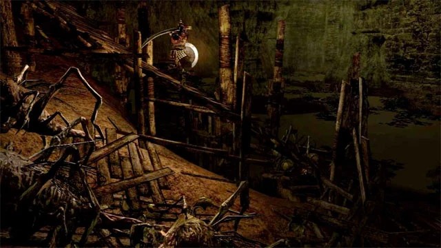 <nowiki> </nowiki>Спускаемся по лестнице, разбираемся с ними, забираем подарок с трупа. Поднимаемся обратно и идем дальше. Здесь развилка: или прыгаем на нижний уступ, где лежит тело с факелом и подарком (Иайто), и еще ниже, к костру, или идем правее, спускаемся по лестнице, переходим по балке и спускаемся по очередной лестнице еще ниже. Слева от нее, будет все тот же костер.