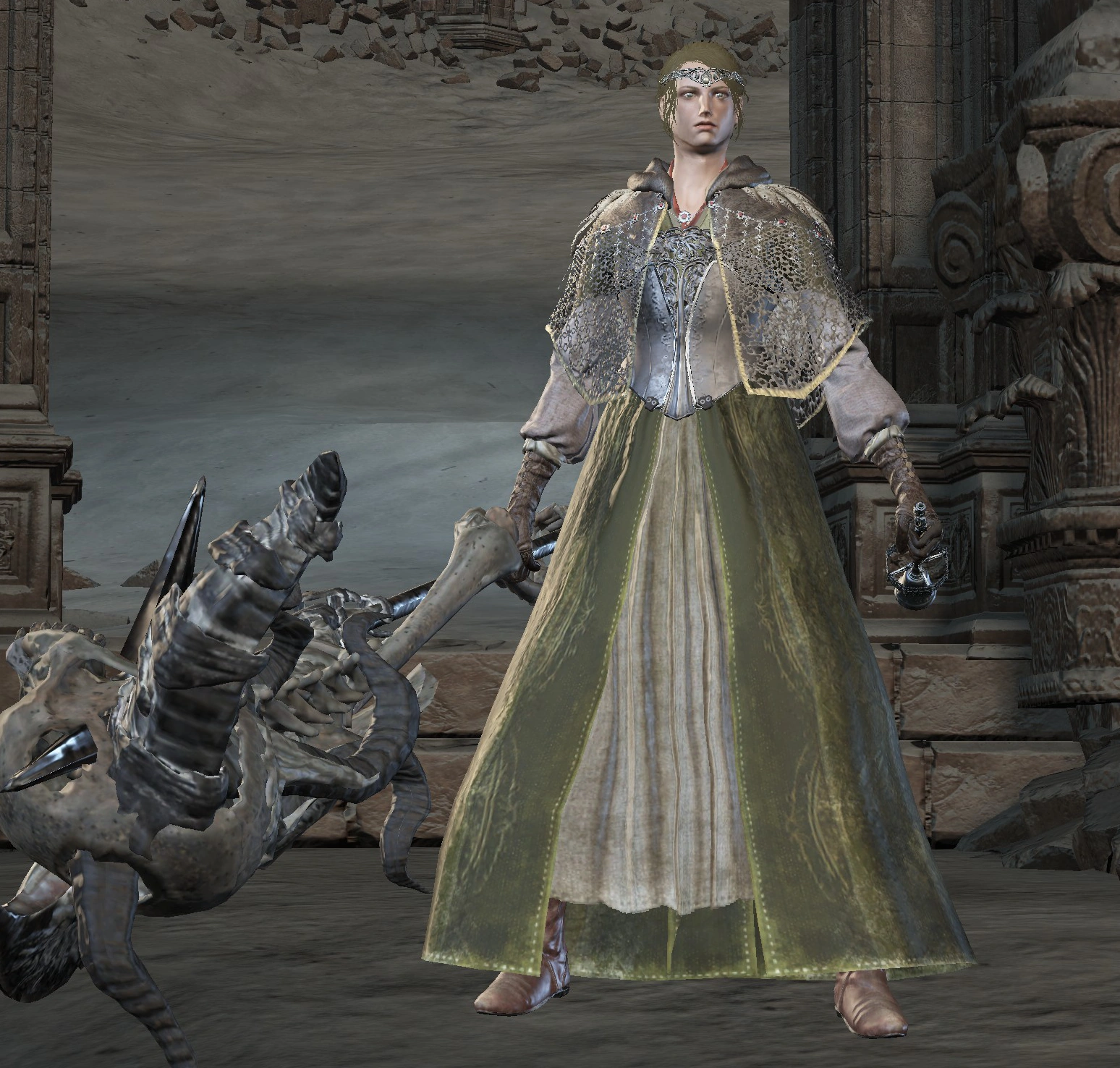 • Может вторгнуться в мир игрока независимо от того, жив ли босс или нет. Если угодно её вторжение, то необходимо зайти в развалины башни арены, которая находится в отдельной насыпном коридоре по правую руку, пройти вперед до упора, и она вторгнется с гневными репликами у вас за спиной.